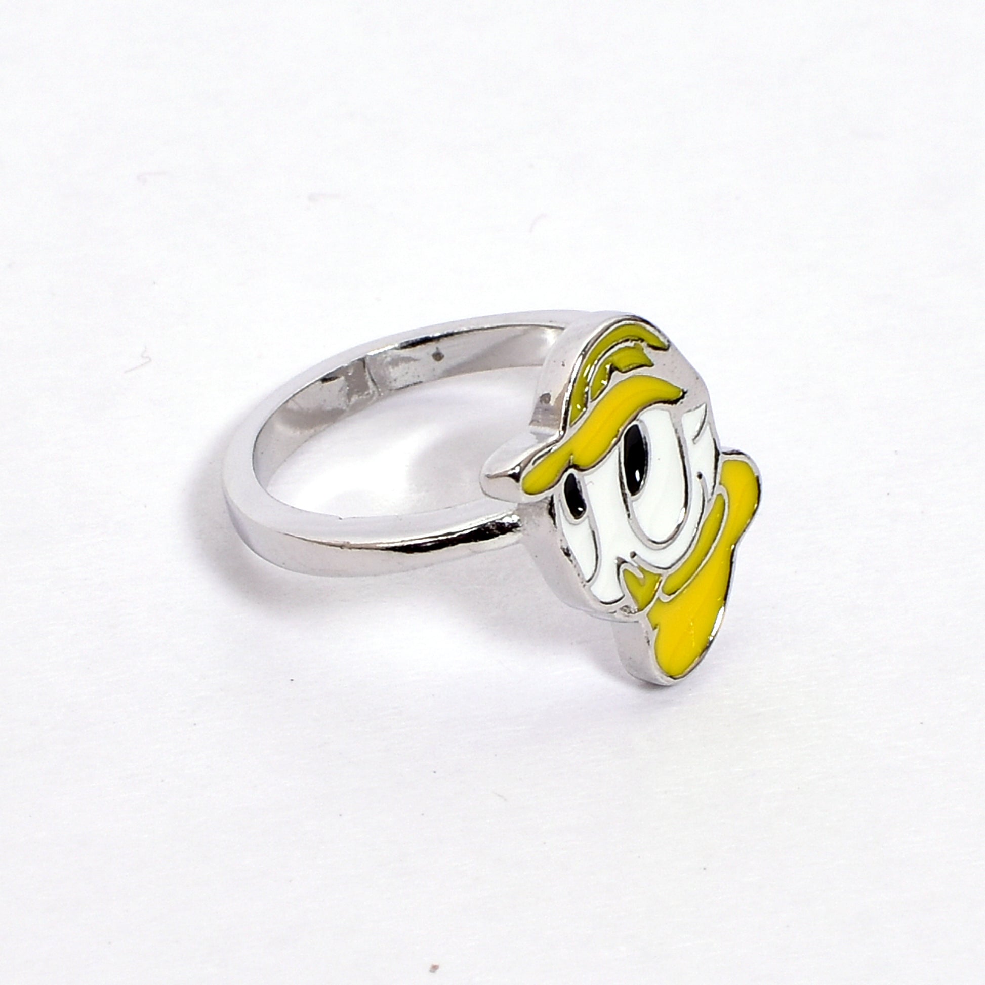 - Design: Silver ring with enamel duck charm in yellow and white